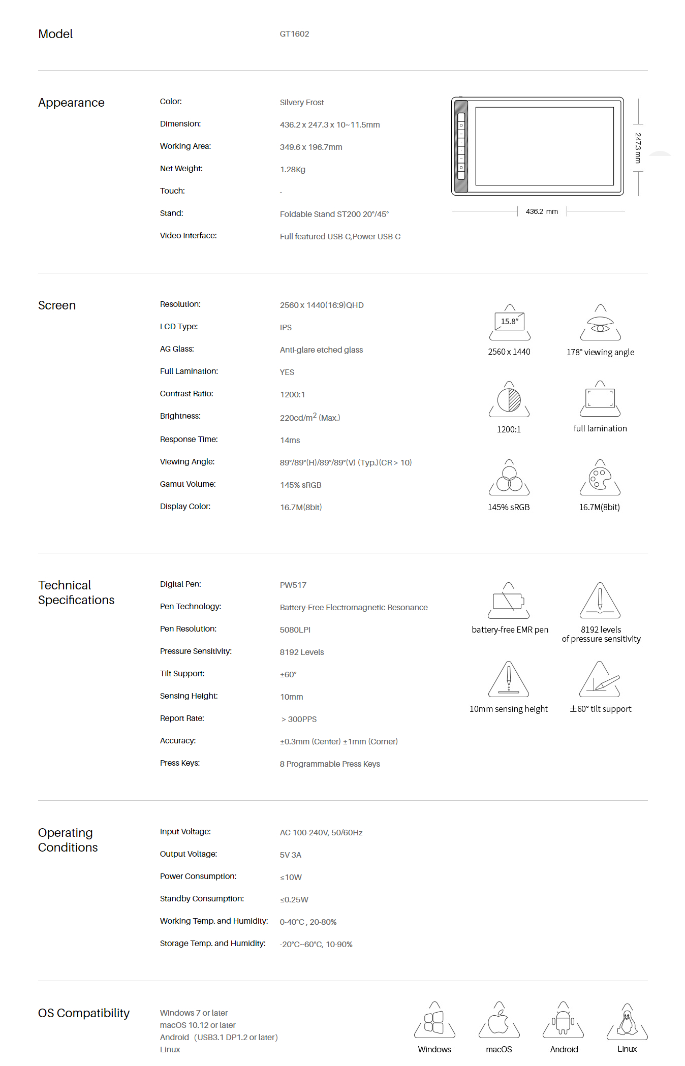 The screen of Kamvas Pro 16 2.5K adopts the quantum dot technology that effectively reduces the harmful blue light and enables a 145% sRGB color gamut. 16.7 million display colors support artists to render more vibrant and realistic artworks.
