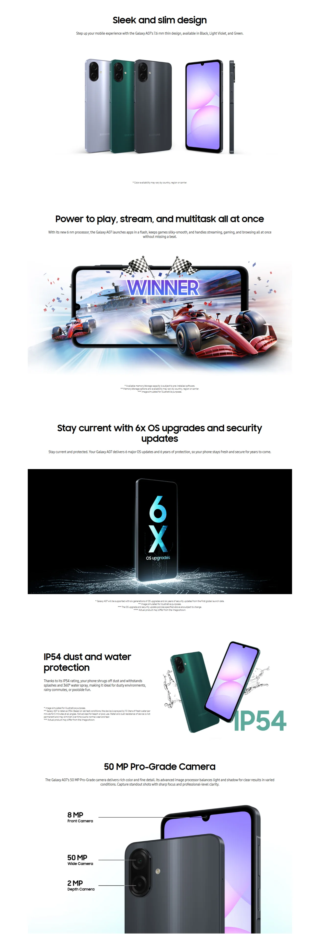 With a long-lasting 5000mAh battery and 25W fast charging, the Galaxy A07 is built to keep up with your busy lifestyle. Its IP54 rating provides protection against dust and splashes, adding durability to its modern design.