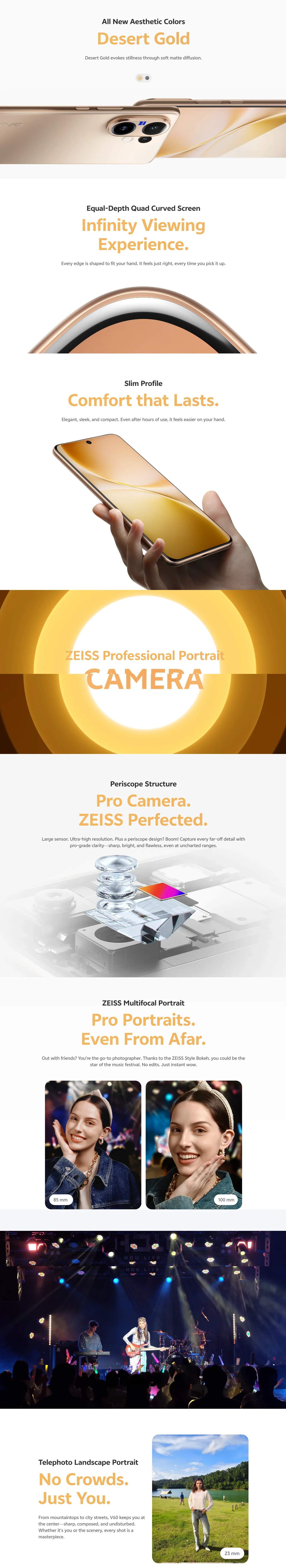 Powered by the Snapdragon 7 Gen 4 (4 nm) processor paired with 12GB RAM, the Vivo V60 delivers effortless multitasking and seamless 5G connectivity. Its triple camera setup, co-engineered with Zeiss optics, offers exceptional image clarity with a 50MP main sensor, periscope telephoto lens, and an 8MP ultrawide camera — perfect for both photography and 4K videography. The 50MP front camera ensures flawless selfies and professional video calls.